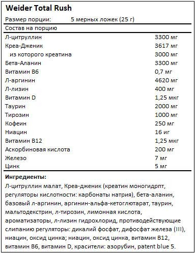 Склад Total Rush Weider на порцію (25 грамів):