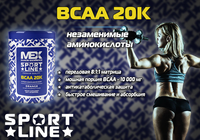 BCAA 20K MEX Nutrition — потужний амінокислотний комплекс у порошковій формі, що містить три незамінні амінокислоти BCAA (L-лейцин, L-ізолейцин, L-валін) у співвідношення 8:1:1, а також глутамін, гліцин, аланін і глутамінову кислоту. Кожна порція BCAA 20K MEX Nutrition, у якій міститься аж 10000 мг амінокислот допомагає поліпшити силові показники та витривалість, стимулює ріст м'язової тканини та прискорює відновлення після тренувань.